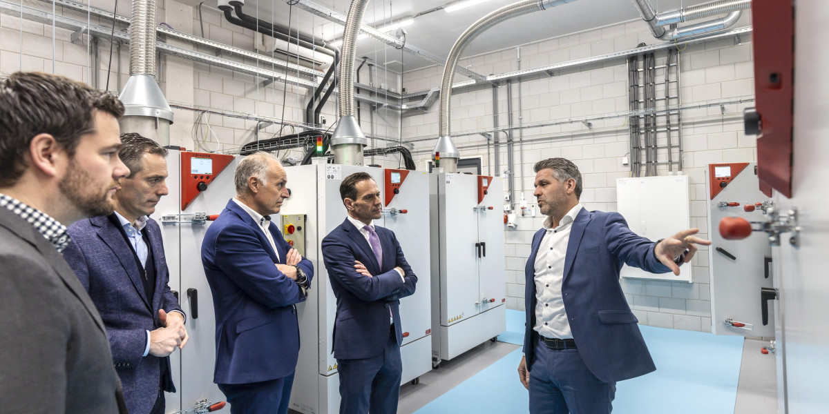 Op de foto staan Henri Koolen, Executive Vice President van VDL Groep (midden) en burgemeester Sjoerd Potters van Gemeente Helmond (tweede van rechts) afgebeeld; zij worden hier rondgeleid door Glenn Haverkort, directeur VDL ETS.